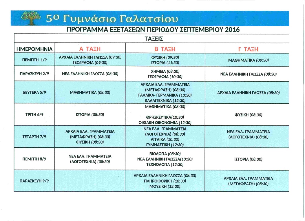 Αναρτήθηκε το Πρόγραμμα Επαναληπτικών Εξετάσεων Σεπτεμβρίου 2016(από 1 έως 9 Σεπτεμβρίου)