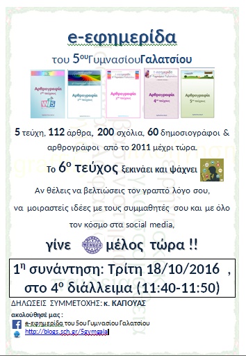 Το 6ο τεύχος της e-εφημερίδαςτου σχολείου ξεκινάει και θέλει συνεργάτες!! Δήλωσε και εσύ συμμετοχή και γίνε μέλος της!!