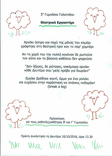 Η ομάδα του θεατρικού εργαστηρίου του 5ου Γυμνασίου Γαλατσίου, διανύοντας τον όγδοο χρόνο της δράσης της, καλεί τα πιστά της μέλη (μαθητές/τριες Β' και Γ' Γυμνασίου και γονείς) στην πρώτη συνάντηση για φέτος τη Δευτέρα 10/10/2016 στις 13.30. Κάθε Δευτέρα στις 13:30 το μεσημέρι με στολή εργασίας και κολατσιό θα εργαστούμε σκληρά, θα παίξουμε μέχρι τελικής πτώσης, θα εκτεθούμε ανεπανόρθωτα πάνω στη σκηνή και θα φτιάξουμε υπέροχες αναμνήσεις!