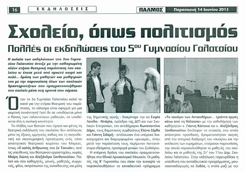 Διαβάστε την συνέντευξη που έδωσε η καθηγήτρια του σχολείου μας κα Χιώτη Μαρία στην συντακτική ομάδα της τοπικής εφημερίδας , με θέμα το Θεατρικό Εργαστήρι του 5ου Γυμνασίου Γαλατσίου: