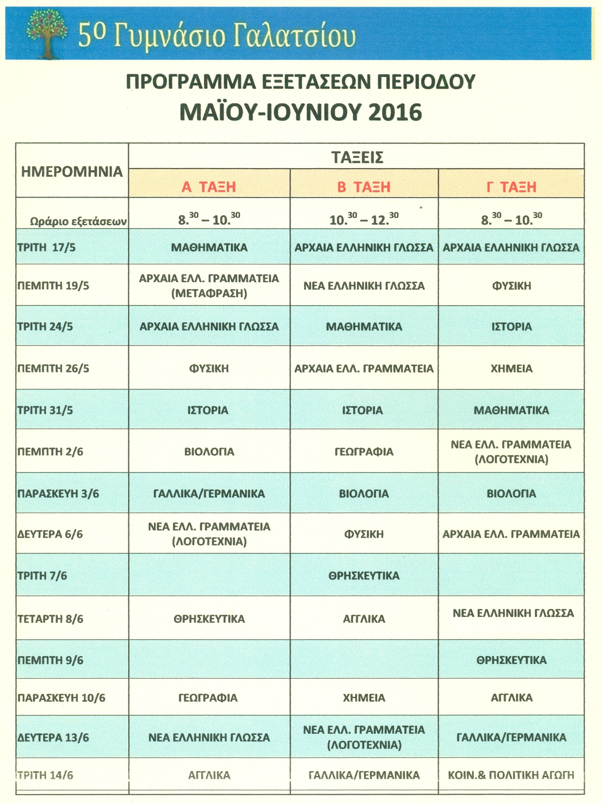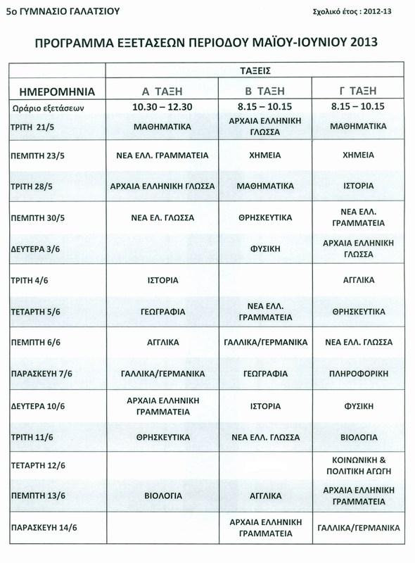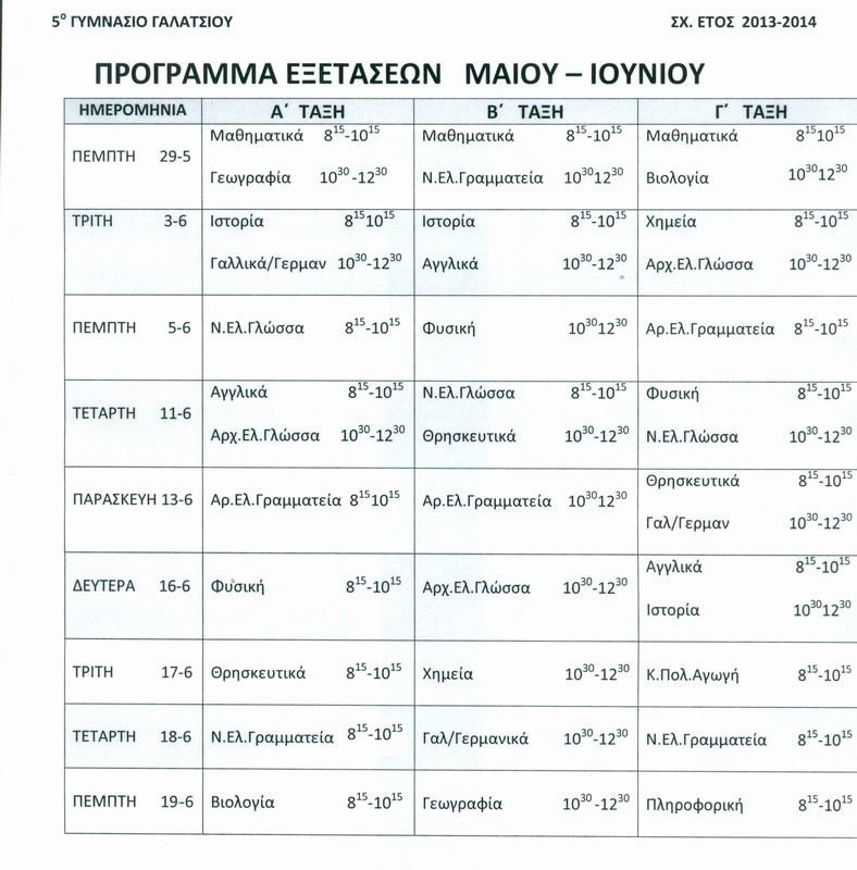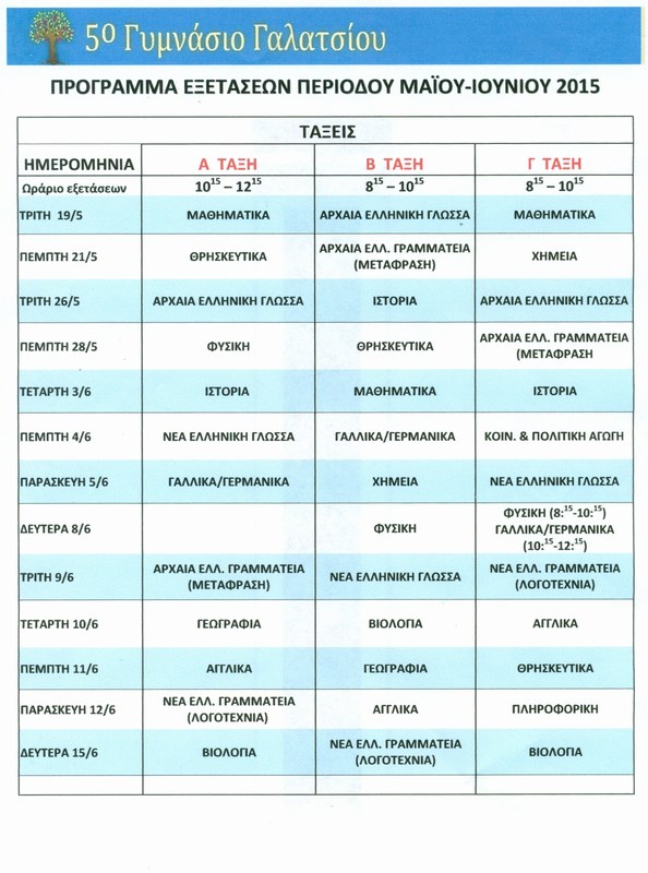 Την Τρίτη 10 Μαϊου τελειώνουν τα μαθήματα .Ετοιμαζόμαστε για τις γραπτές εξετάσεις που ξεκινάνε την Δευτέρα 16 Μαϊου και θα κρατήσουν μέχρι και την Παρασκευή 10 Ιουνίου.Δείτε το πρόγραμμα των εξετάσεων Μαϊου-Ιουνίου 2011