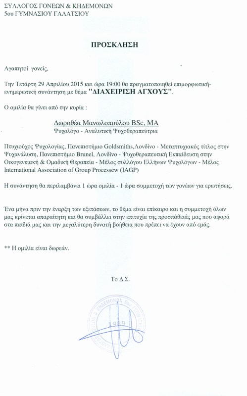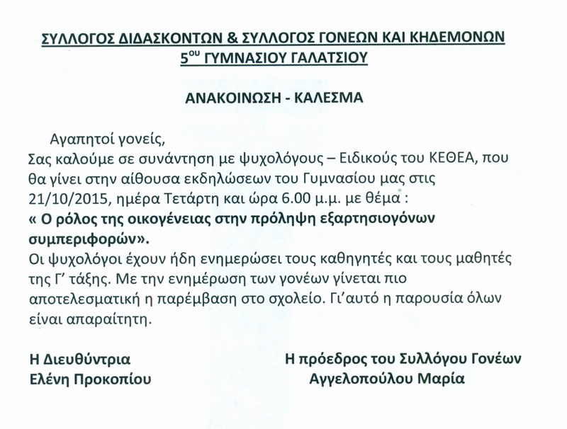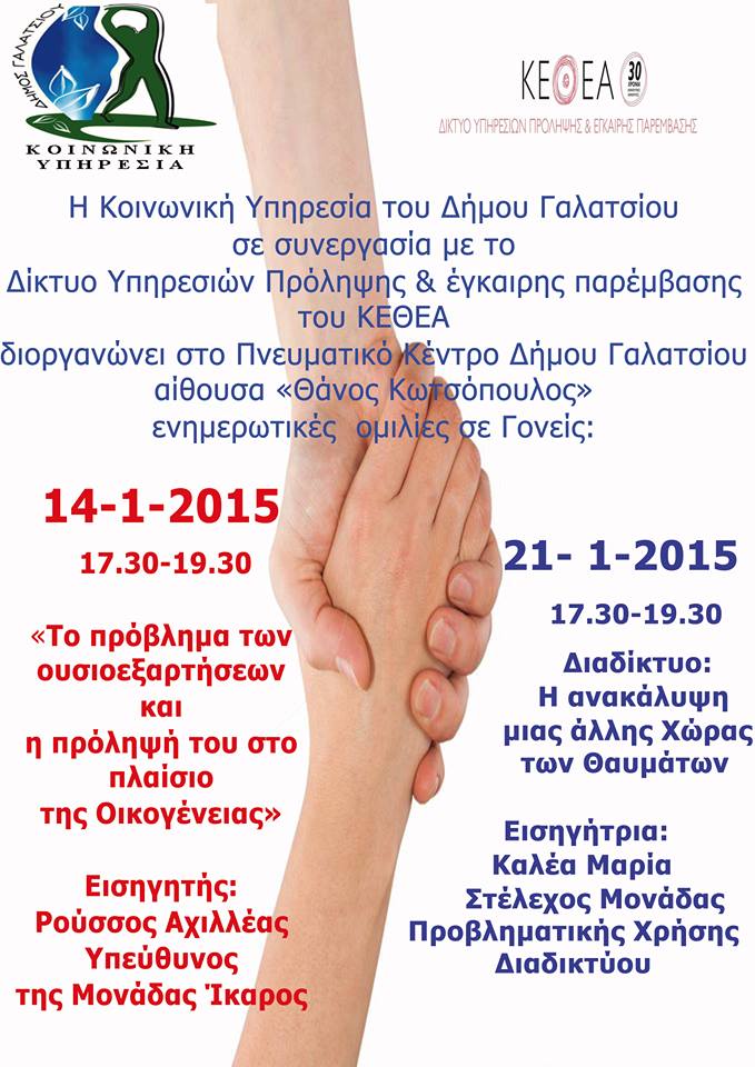 Την Τετάρτη 21 Οκτωβρίου 2015 και ώρα 18:00 θα πραγματοποιηθεί συνάντηση με ψυχολόγους -ειδικούς του ΚΕΘΕΑ με θέμα "Ο ρόλος της οικογένειας στην πρόληψη εξαρτησιογόνων συμπεριφορών"