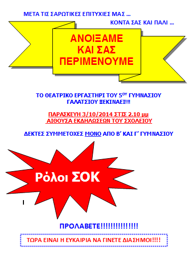 Η ομάδα του θεατρικού εργαστηρίου του 5ου γυμνασίου Γαλατσίου, όπως κάθε χρόνο, ετοιμάζεται να ανοίξει τα πανιά της και να σαλπάρει για περιπέτειες στον ωκεανό της τέχνης και του ονείρου...Όσοι επιθυμούν να ταξιδέψουν μαζί μας, ας τρέξουν να επιβιβαστούν!
