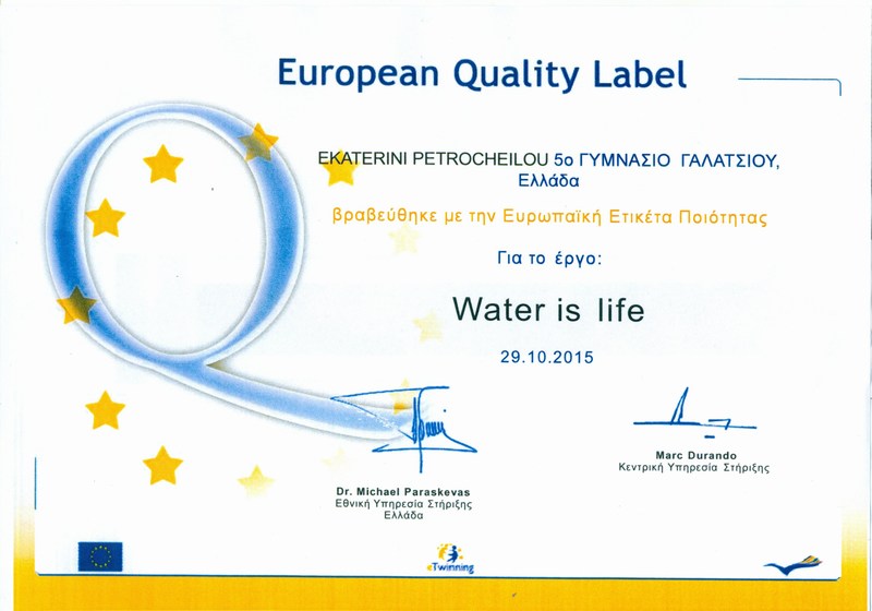 Το σχολείο μας βραβεύθηκε με την Ευρωπαϊκή Ετικέτα Ποιότητας για την τελειότητα της εργασίας μας στο έργο eTwinning "Water is life". Πολλά συγχαρητήρια στην υπεύθυνη καθηγήτρια του έργου κα Πετροχείλου Αικατερίνη(ΠΕ 06) και στους μαθητές & μαθήτριες της ομάδας της.