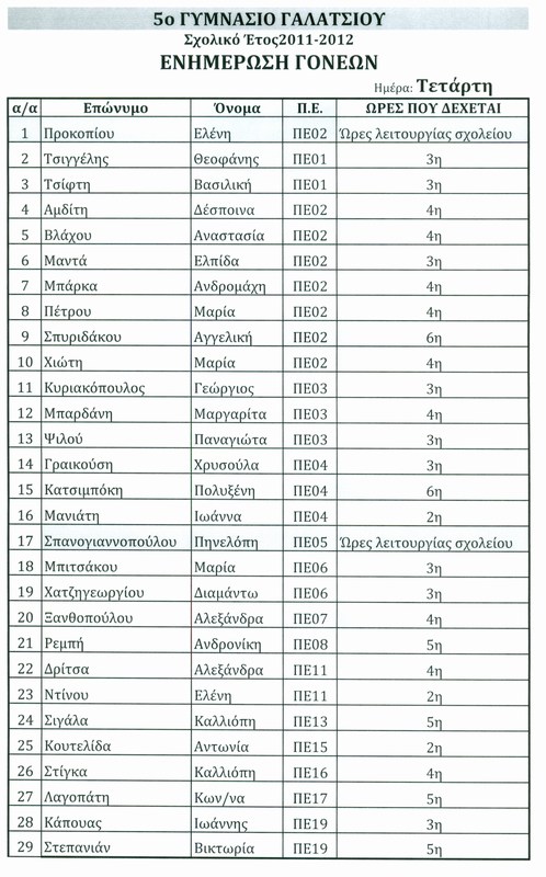 Την Τετάρτη 21/9/2011 και ώρα 18.30 θα γίνει ενημέρωση των γονέων των μαθητών/ριών της Α' Τάξης από τους καθηγητές του σχολείου μας.